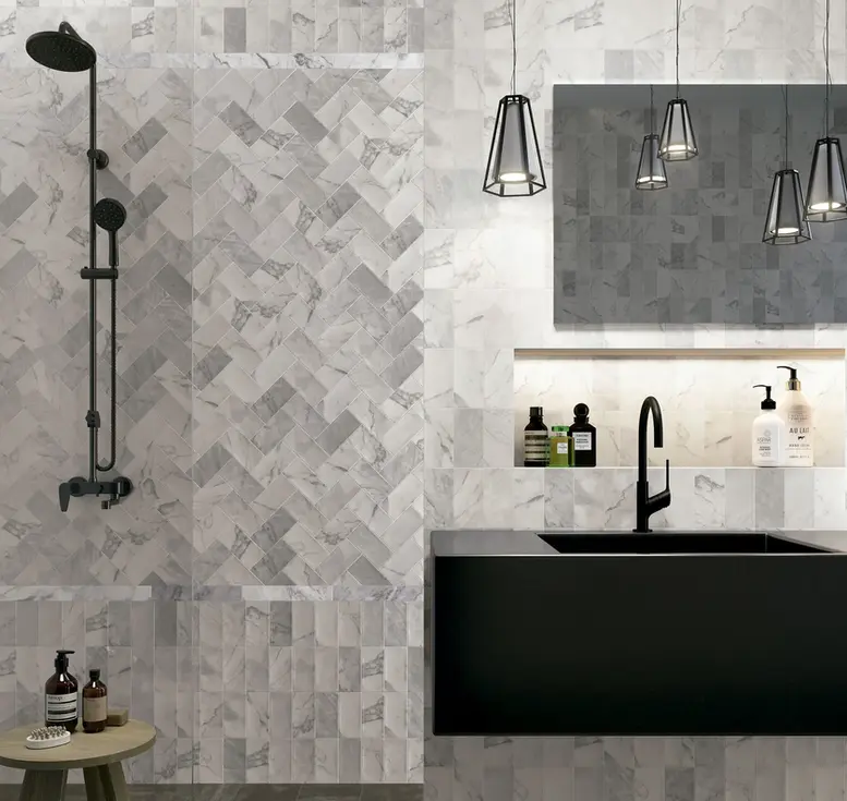 Le mariage du style zellige et des veines marbrées crée un effet sophistiqué parfait pour les intérieurs modernes, chic ou méditerranéens.